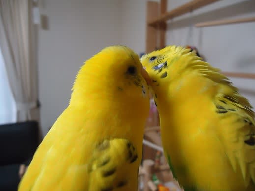 仲良しな2羽だけど、レモンの鼻にほわ毛がついてるのが気になる