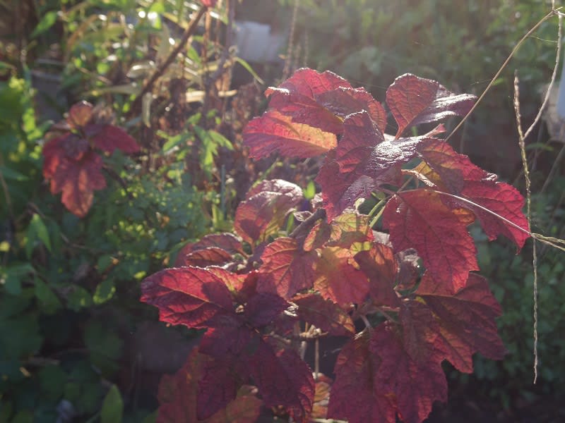 柏葉アジサイの葉が朝日を浴びて綺麗です。
