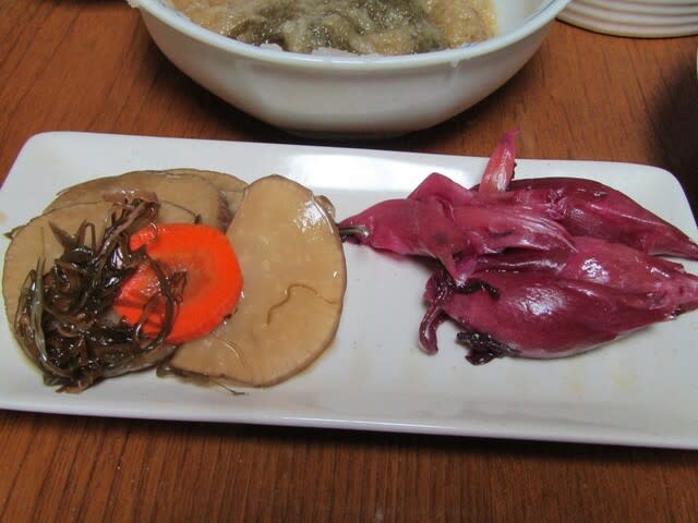 いぶり大根の昆布漬けとミョウガのしば漬け、しば漬けがとってもいい色に出来上がりました。
