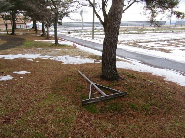 落ち葉を集める道具の忘れ物かな?早く気が付いて寄せないと雪に埋もれちゃいますよ。