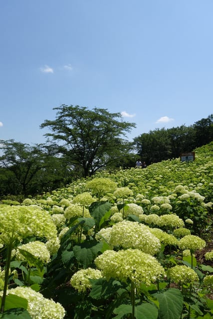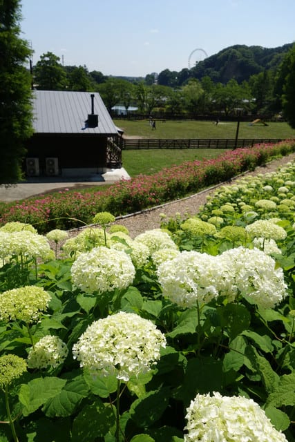 しばらく歩くと白いアジサイ(アナベル)が咲いてます。この写真の遠くに見える観覧車はサマーランドの観覧車です。