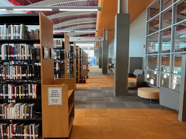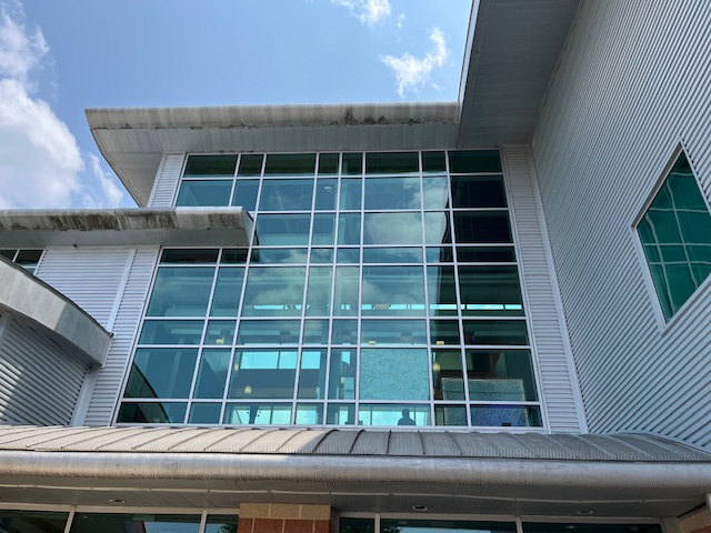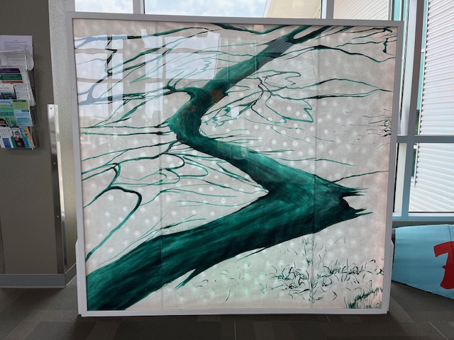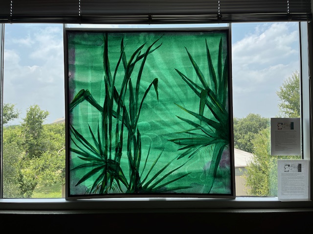Using translucent kozo paper and techniques that she learned while in Japan, Booth created large-scale paintings of native plants that are displayed in the library’s massive windows, allowing natural light to filter through their lush colors. According to Booth, the paintings look different at different times of the day because of the filtered light.