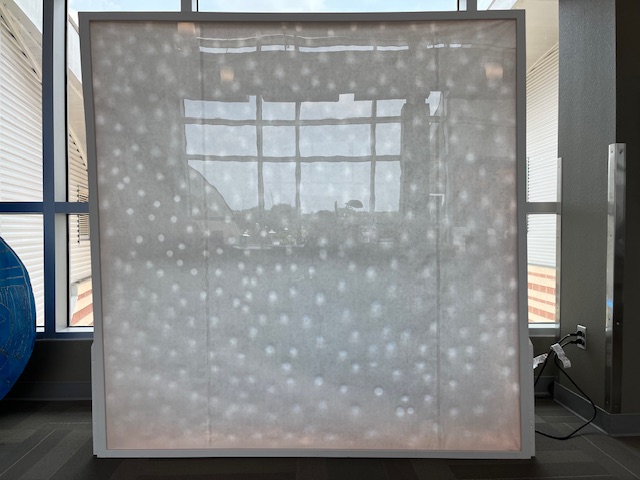 Several of Booth’s paintings from “Snow Shadows,” a documentation of Winter Storm Uri that were featured at artpace in 2022, are also on display. In these, she replicated shadows from dying plants that were irreparably frozen during significant snowfall and week-long freezing temperatures. These paintings, also on kozo paper, are backlit with color-changing LED lights rather than natural light, giving off a cooler visual sensation.