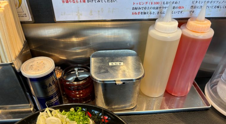 刻み玉ねぎは卓上に置いてある無料トッピングだ。