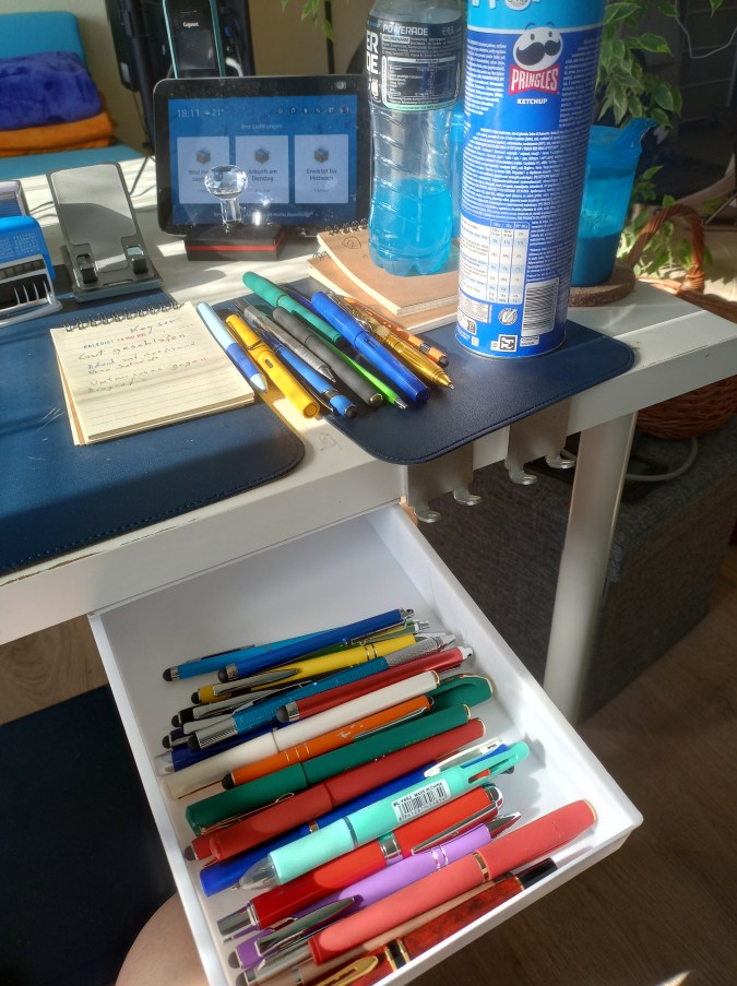 Zwei Tage zuvor hatte ich noch eine andere Abteilung gegründet, die sich auf drei Stand- und Liegeorte erstreckte. Die Abteilung Stifte. Diese umfasst eine Vielzahl von Stiften von sich angesammelt zusammengekauft habenden Schreibgeräten, mit denen ich Handschrift übe oder die ich einfach mag, weil ich Stifte, Füller, Kulis und Füllfederhalter einfach schön finde. Apropos: Gelstifte mag ich sogar besonders, ohne wirklich welche zu haben, mit denen ich auch schreiben könnte.