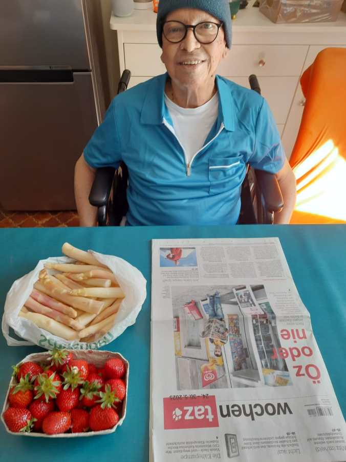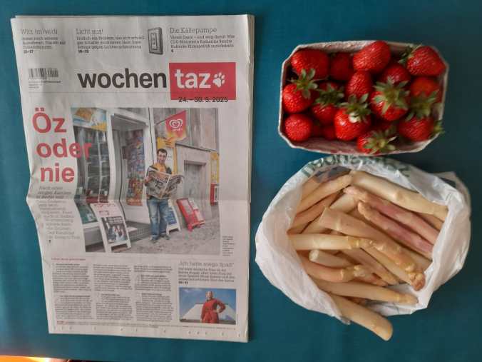 500 Kilometer hin, zwei Stunden Besuch bei uns, mit morgens hier vom Hof gekauften Spargeln und Erdbeeren. Nach nettem Geplauder und Beisammensein Heimfahrt 500 Kilometer zurück nach Belgien: Das war heute das Programm meiner beiden Zwillingstöchter Candy & Salome. Sie haben es sogar geschafft mir ziemlich lange zuzuhören, was selbst für Lilli erstaunlich war. Wir waren ganz locker und alle gut drauf. Vor ihrer Abfahrt haben wir gegenseitig noch ein paar verabredete Mitbringsel getauscht (Sachen, die es im anderen Land nicht gibt wie zum Beispiel belgischer Klosterkäse und deutsche Pfanni Knödel) und Grüsse mit auf den Weg gegeben. Das alles bei schönstem Sonnenschein. Ein richtig schöner Tag ist das heute.