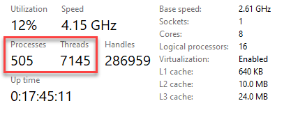 Here is a snapshot of my Task Manager showing the total number of threads and processes: