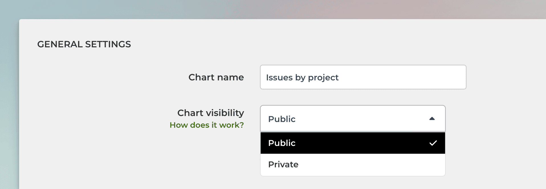 If a chart is set to private, it appears only to you in the Charts tab. Other users in your account cannot view it. You can still add the chart to a report. When you do, the chart becomes visible to anyone who has access to that report.