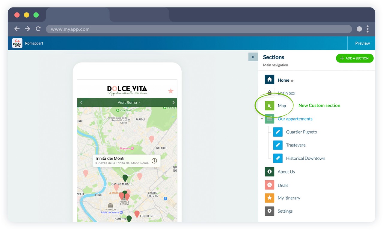 När installationen är klar visas en ny sektion för Custom Map i menyn i din app. Du kan byta namn på det här avsnittet som du vill.
