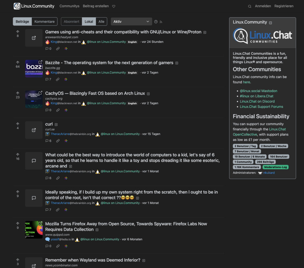 Manche großen Reddit-Communities haben Lemmy-Ableger gegründet, um eine zensurresistente, gemeinschaftskontrollierte Alternative in der Hinterhand zu haben. Trotz dieses Wachstums steht Lemmy noch am Anfang. Die in Rust geschriebene Software wird aktiv weiterentwickelt und ist unter der AGPL lizenziert.