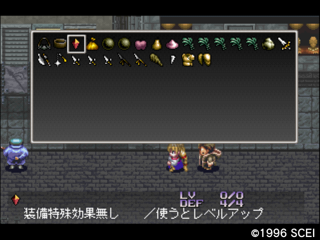 本編データの進行は、一時中断する。本編データで入手したアイテム・貝殻と一角獣の角などをデータ3(貝殻を装備した状態で特定の敵を倒すと、一部アイテムが変化する。そのアイテム回収用データ)にトレード。さっそくそのデータでアイテムを回収していく。3種ある。