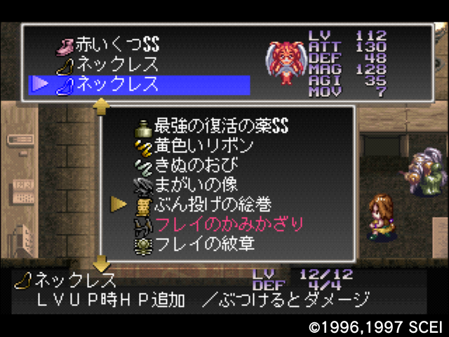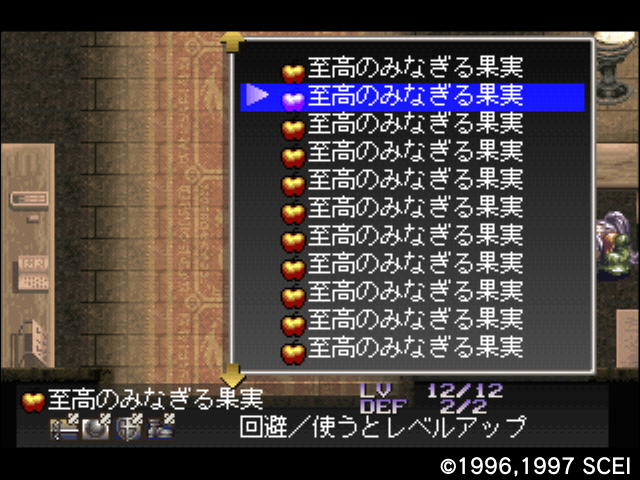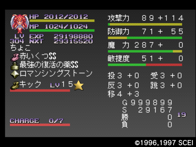 アークザラッド2 倉庫整理など。 モンスターゲームを利用して、至高のみなぎる果実(使用すると、レベルが6上がる)を増殖させる。ちょこにネックレス(装備中にレベルが上がると、最大HPが3上昇)を2つ装備させてから、それを使用する。ちょこのレベルが304になる。他の女性キャラとエルクのレベルも300以上にすることに。