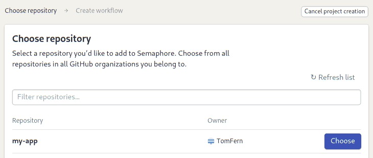 Semaphore will show your repositories. Click Choose next to your Python project: