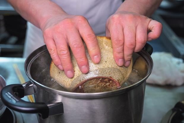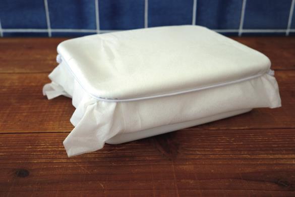 4.沸騰する直前に火を止める。完全に冷めたら、ホウロウ製の容器に移し、キッチンペーパーをかけ、冷暗所で3日以上熟成させる(上写真)。