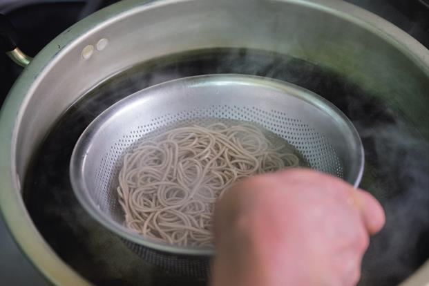 そんな蕎麦の老舗に、「乾麵」でいかにすればおいしい蕎麦がつくれるのかを指南してもらった。蕎麦つゆも手軽な市販品を使った。手打ち麵と乾麵とでは茹で方から違ってくるが、小高さんはいつものように手際よく進めていく。