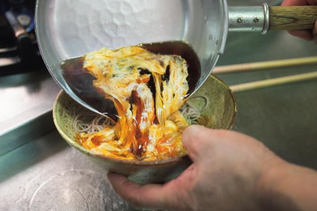 たまごは溶きすぎず、煮えたつゆにさっと回し入れ、すぐに火を止める。この間ほんの数秒。温めた麵を入れた器に移せば、滑らかなたまごとじそばの出来上がりだ。