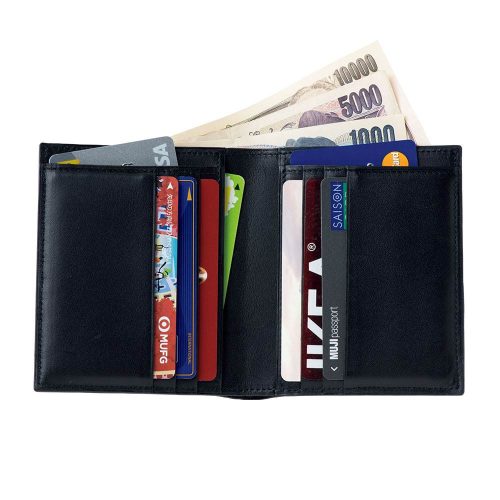 また二つ折り札入れはコンパクトな形状で、ジャケットやスーツの内ポケットにもピタリと収まり、内側10か所のカードスリットのうち2か所は、名刺が収納できる大きめの寸法だ。