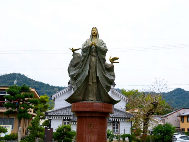 大手川の畔から自らの居城である宮津城を眺める「細川ガラシャ夫人像」。