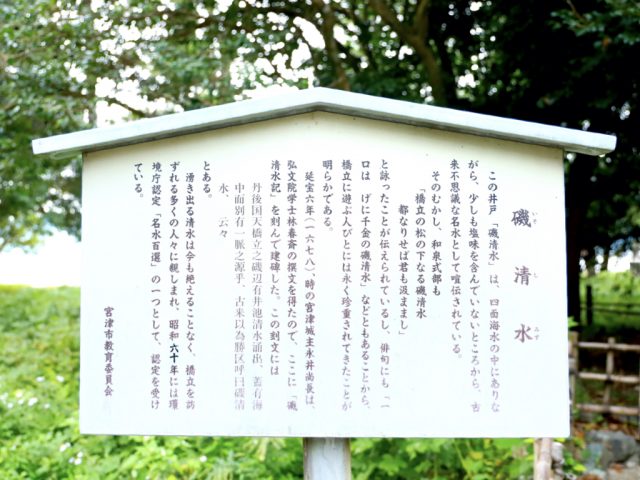 と詠ったことが伝えられているし、俳句にも「一口はげに千金の磯清水」などともあることから、橋立に遊ぶ人びとには永く珍重されてきたことが明らかである。延宝六年(1678)、時の宮津城主永井尚長は、弘文院学士林春斎の撰文を得たので、ここに「磯清水記」を刻んで建碑した。