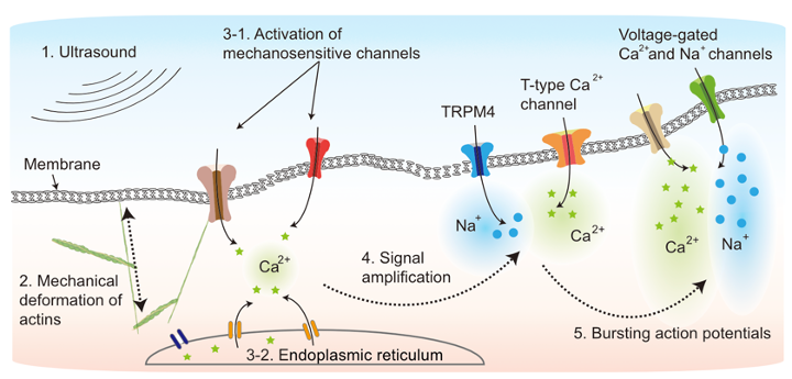 Focused ultrasound excites cortical neurons by opening specific mechanosensitive ion channels, leading to gradual calcium accumulation, activation of calcium-gated channels, depolarization and spiking. Congratulations to Sangjin and collaborators on this detailed biophysical study.