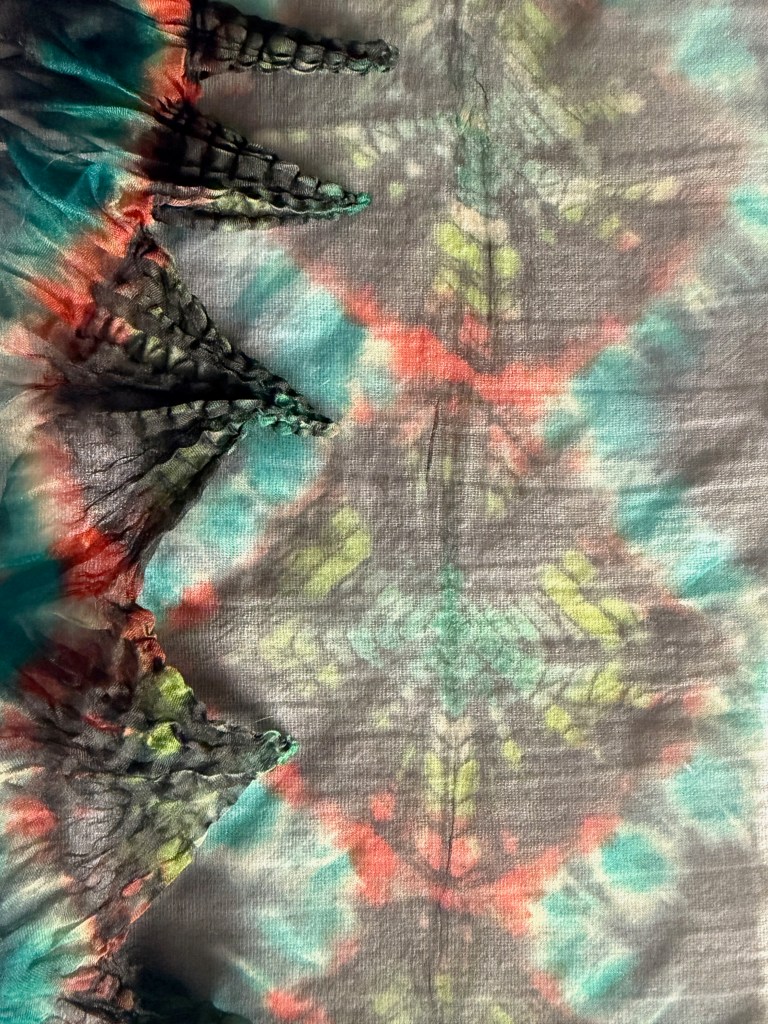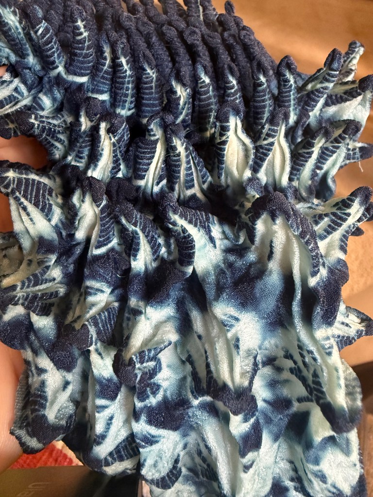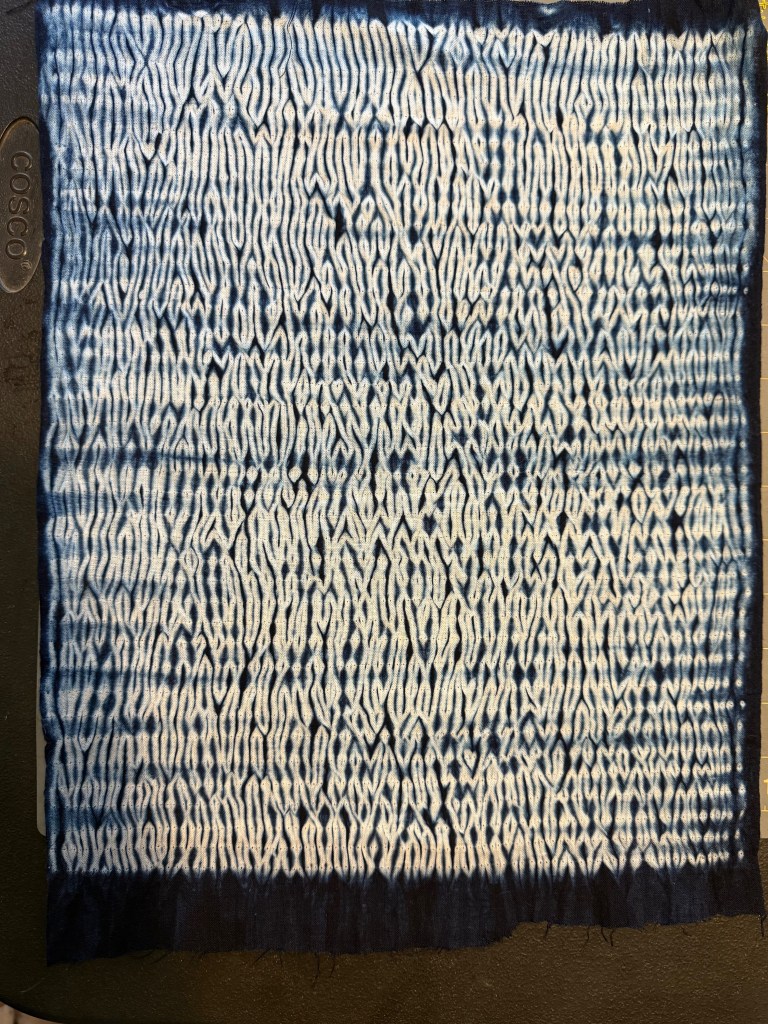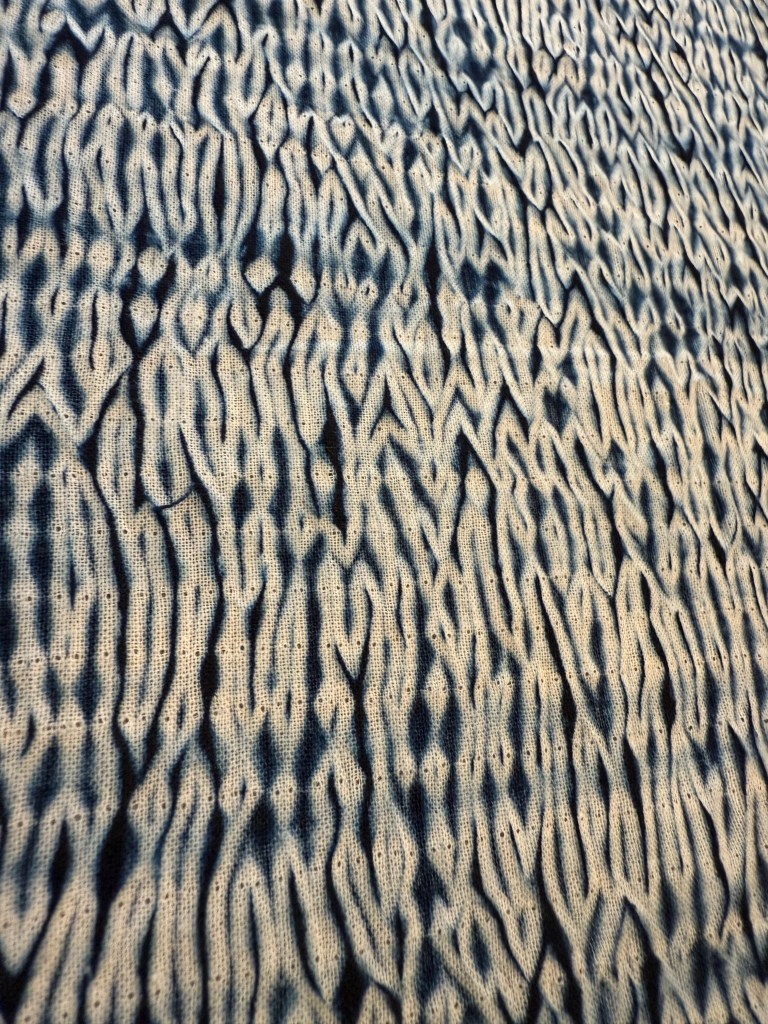 I bought the above piece anyway even though the shop owner was very clear that it wasn’t well dyed and not made in Japan. It has some good shibori techniques represented and was only ¥1000! It will make a good sample piece.
