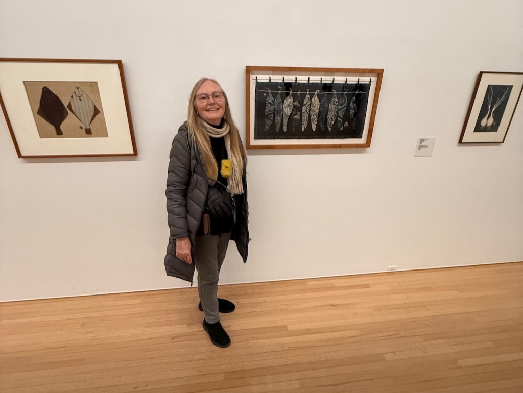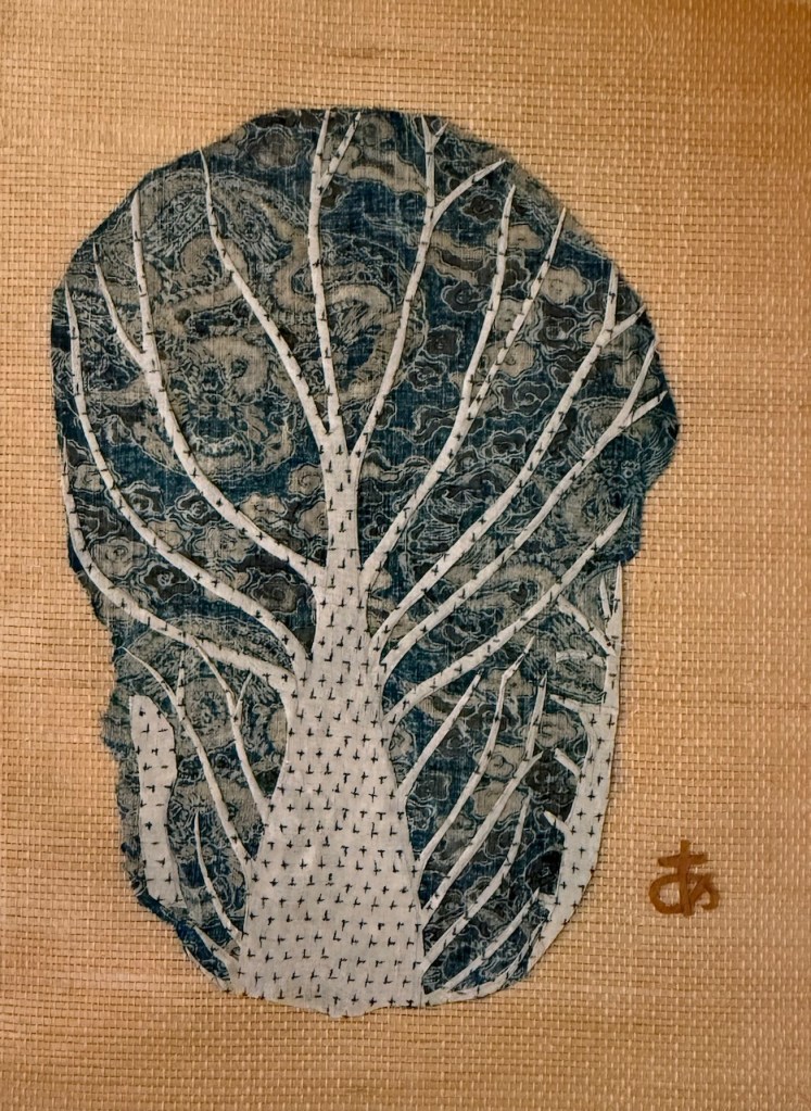 The first being the Toyota Municipal Art Museum in Toyota City. In and of itself, it’s a beautiful building and an architectural delight. Inside, it contained what I had come to see. The work of Ayako Miyawaki in person. It was definitely worth the hour travel to get there from Nagoya. I wanted to see the stitches in person, the layering of cloth and fibers. It did not disappoint one bit. An added bonus was to see the paintings of her husband Haru Miyawaki shown in the same gallery. It even snowed while we were there! Phil was thrilled even though it wasn’t sticking. aside from lots of interesting art, there was a special gallery featuring the work of urushi (layered lacquer) artist Takahashi Setsuro. Wow! Urushi like never before. There was also a nice cafe where we had a delicious $15 lunch set with a great view of the courtyard.
