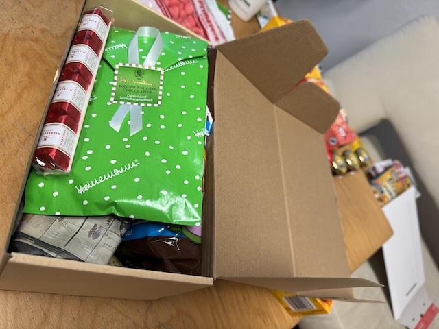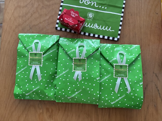 一時帰国前にはドイツ土産を探します。日本にいる家族や友人へのドイツ土産。大抵は包装せずに渡しますが、コンディトライでちょっといいチョコレートを買った時はお店の人にプレゼント用に包んでもらいました。