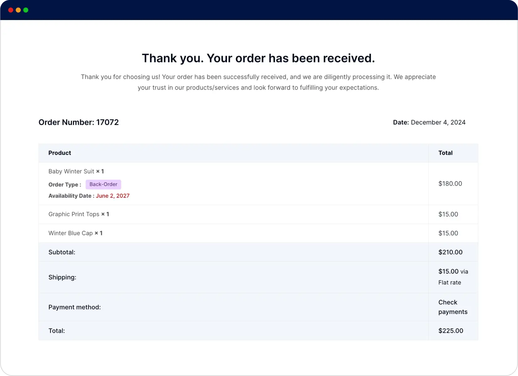WooCommerce’s order confirmation page also displays the back-order item notice after the successful purchase. The ‘Back-order’ and ‘Expected Availability Date’ notices appear beside the product line.