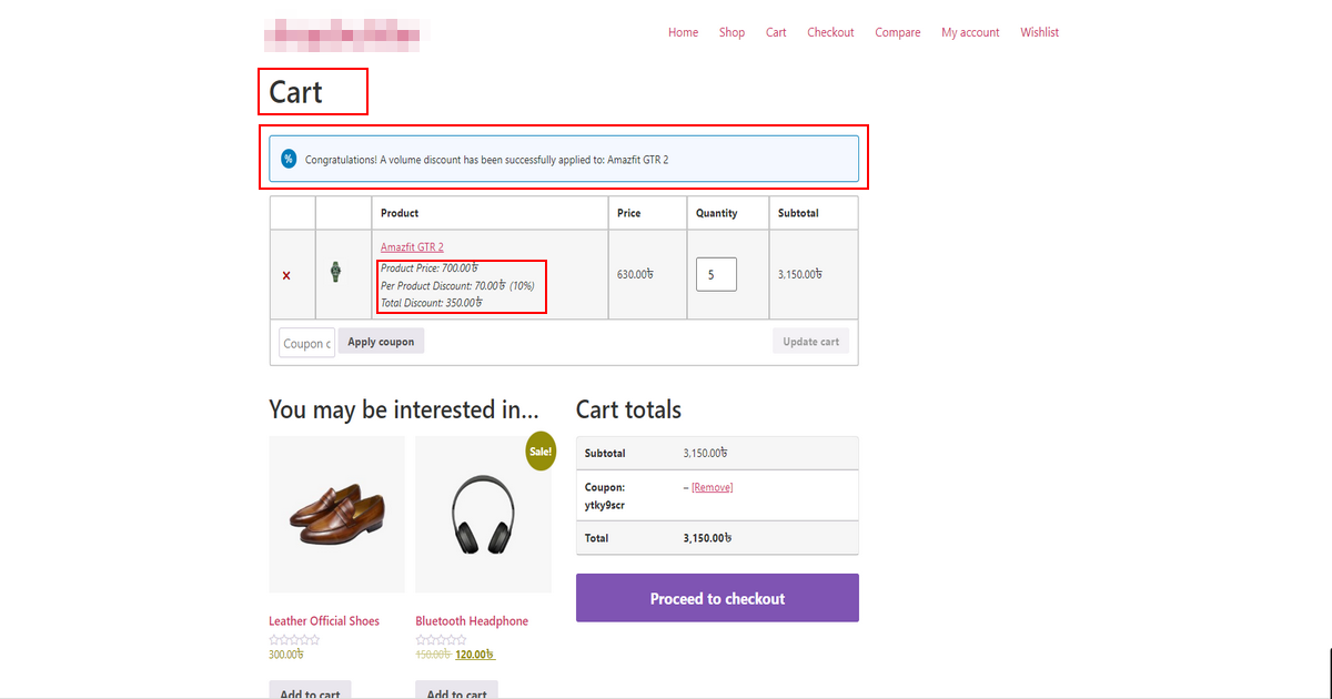 In the “Cart Page” customers will receive a congratulation message on adding the discount and the details of the discount in the cart table.