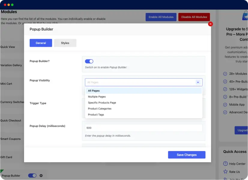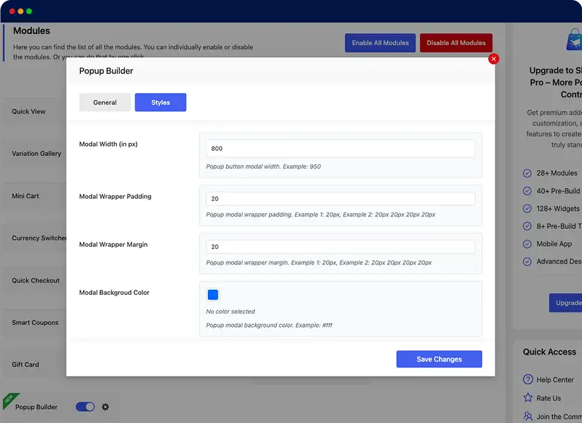 Then, head to ShopBuilder’s Settings > Modules > Popup builder. Finally, enable it and customize it as per your needs.
