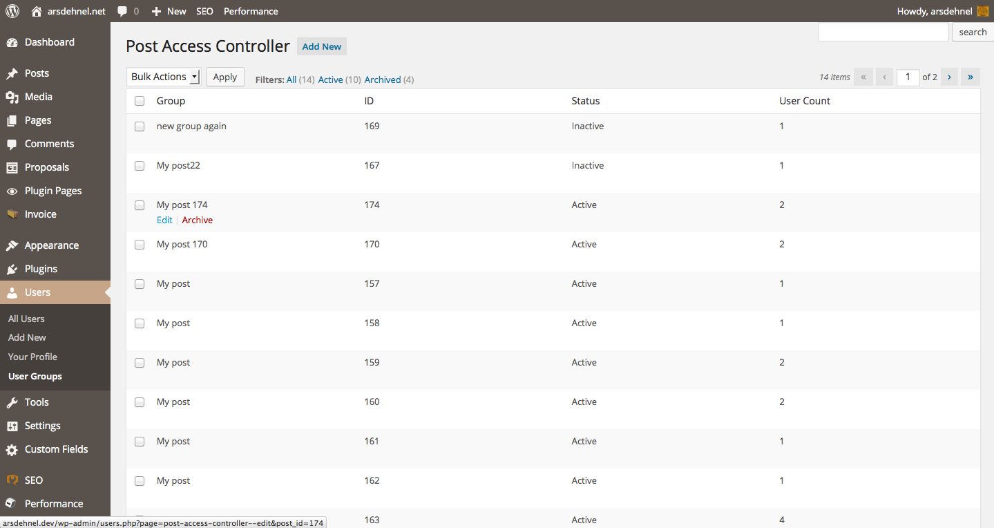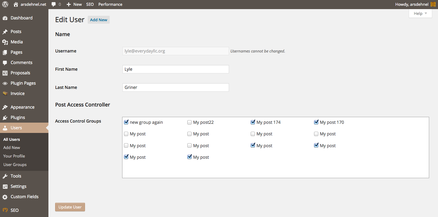 As mentioned above, each post can have one or many user groups that are given access to a particular post. These groups are maintained through the “User Groups” forms that live within the “Users” menu in the WordPress admin. You can create as many user groups as you’d like and assign users to whichever groups make sense. There is no limit to the number of users within a group and there is no limit to the number of groups a given user can be in. These groups can make this a great tool for websites for organizations that have committees or teams that need access to some information but that information is not public. A user group can be setup and re-used over and over. And then if a member leaves (or is added) it only needs to be maintained in that one group definition rather than adjusting all of your posts.