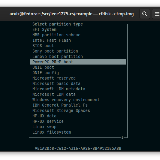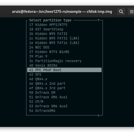 Installation media uses MBR. I wrote a small mbr-parser subcrate using explicit-endian types so little-endian LBA fields decode correctly on big-endian hosts. It recognizes FAT32, FAT16, EFI ESP, and CHRP (type 0x96) partitions.