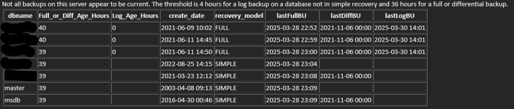 Here is an example email I have going out, with the subject “Backups are not current on <servername>”: