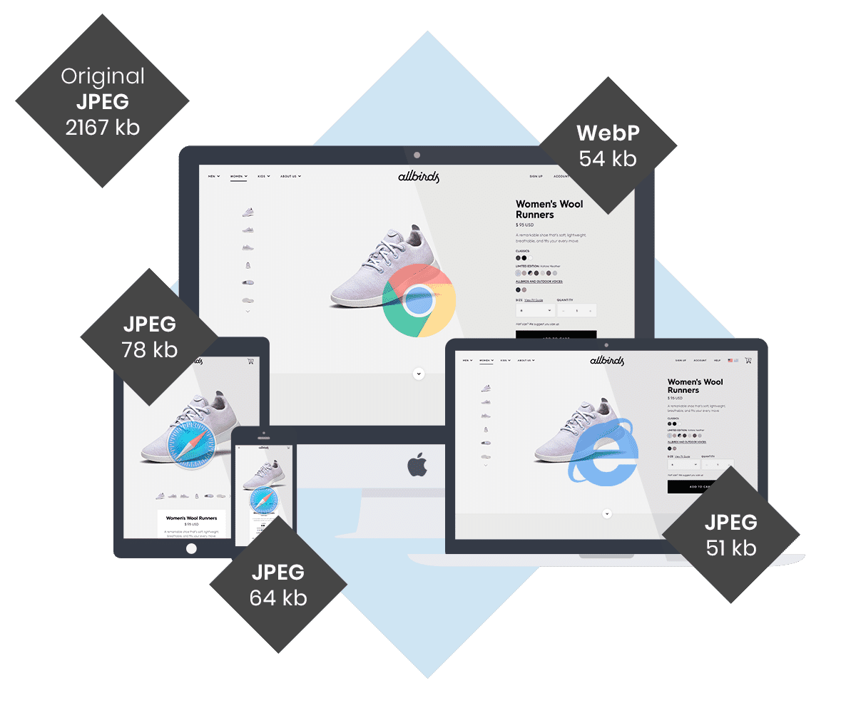 Sirv delivers the most optimal image format for each image. The smallest image is often WebP, so Sirv automatically generates these amazingly small images to browsers which support them (Chrome and Opera). Other browsers receive a JPEG or PNG, depending on the image.
