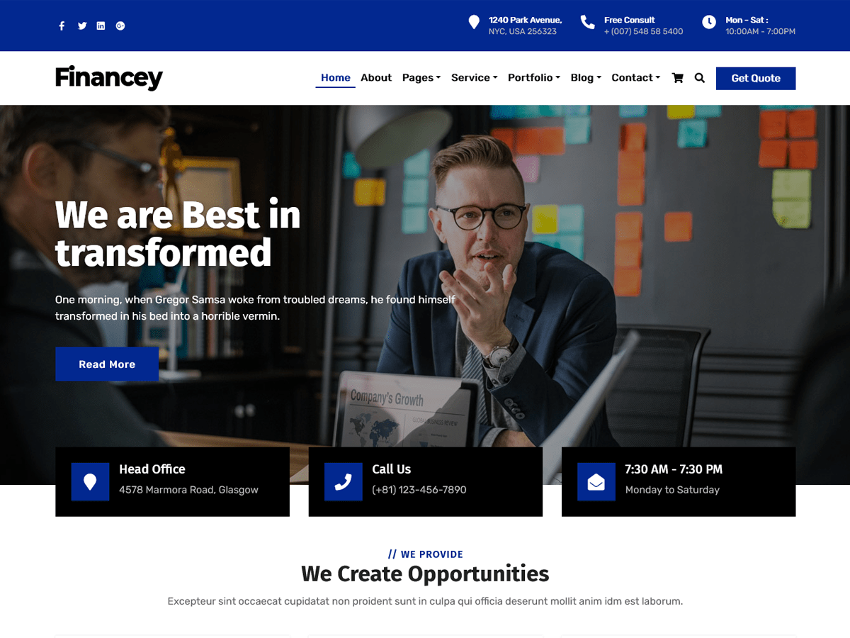 Financey WordPress theme ideal for a business or perfect solutions for corporate, consulting, wedding planners, agency, law firms, finance, law travel, recipes, sport/medical shops, startups, online agencies, portfolios, freelancers, E-commerce. The theme is responsive, WPML, Retina ready, SEO friendly (Live preview : https://demos.themeansar.com/agencyup/transparent/)