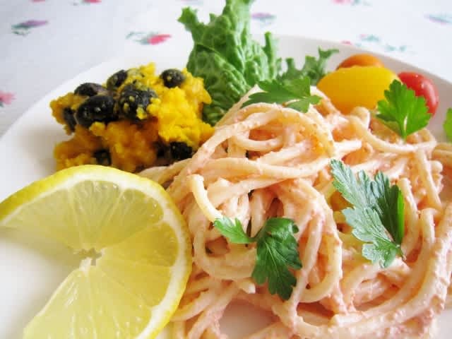 めんたいこパスタ・パンプキンサラダ・スープ