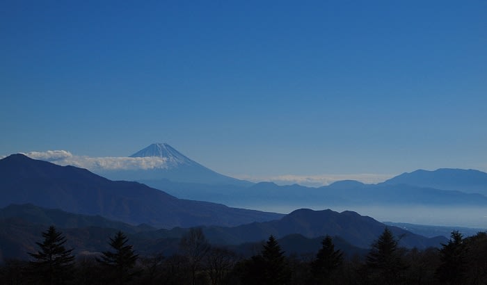 富士にたなびく雲、そしてそれに連なる山々の麓の町を覆う靄。