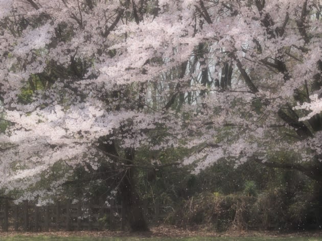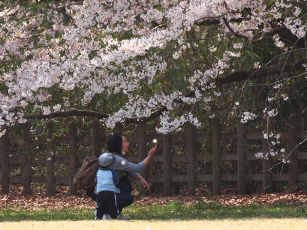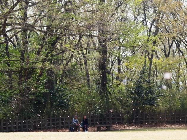 広場の桜の下は花びらの絨毯、カメラを高く上げて