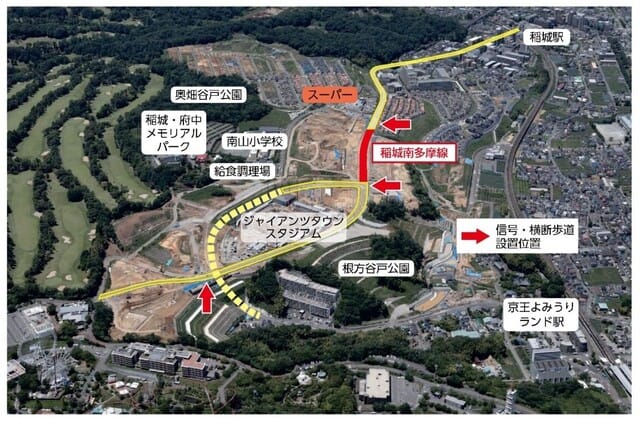 ヤオコー稲城南山店からジャイアンツタウンまでの道路(赤色)です。