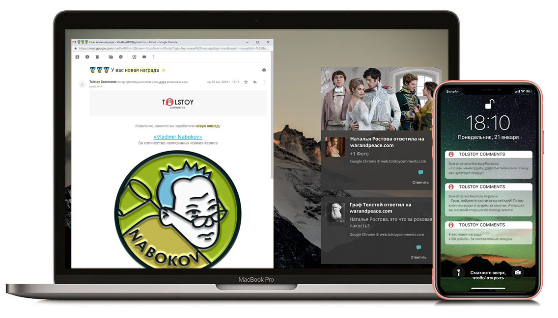 Tolstoy Comments умеет возвращать пользователей на ваш сайт push-уведомлениями и e-mail-рассылками. Пользователь ни за что не пропустит ответы на свои комментарии, новые оценки и награды.