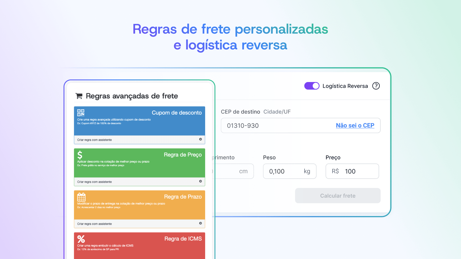 Regras de frete personalizadas e logística reversa.