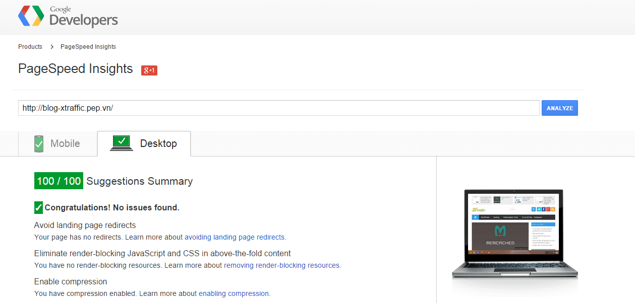 • Result Google PageSpeed Insights Desktop Score 100/100 after optimize with “WP Optimize Speed By xTraffic” plugin