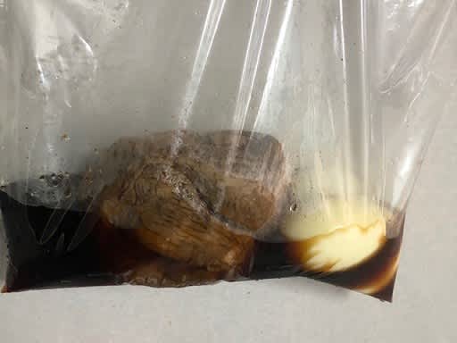 柔らかく煮たブロック肉をたれに一晩つけこみます。
