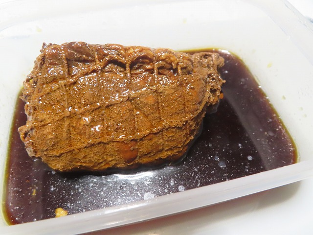 茹で上がった豚肉を調味液に浸して一晩おきます。