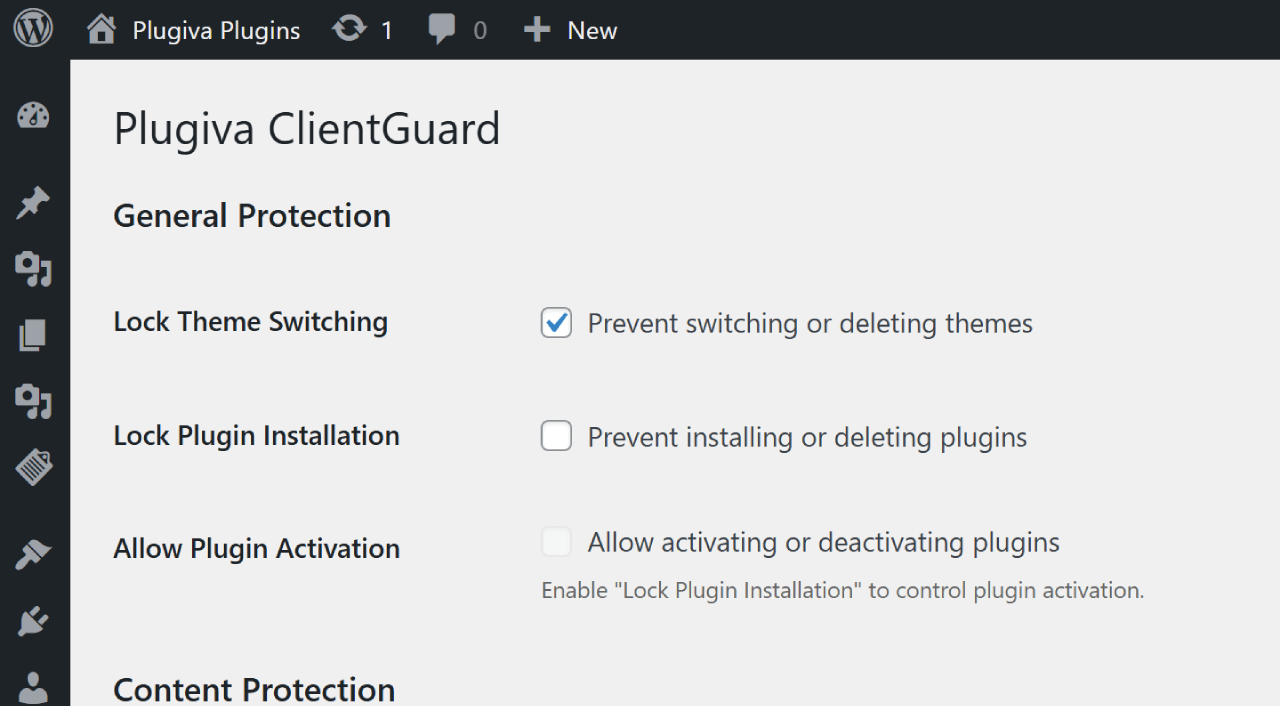 Plugiva ClientGuard helps site owners and administrators prevent accidental or unwanted changes in the WordPress admin area.