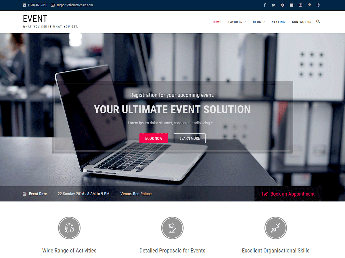 Event is Ultra Responsive, multipurpose, retina-ready and SEO optimized multifunction Event Conference, Business and Blog WordPress theme. It is designed for Event but this is competent for every kind of site which is designed and developed by Theme Freesia. This theme supports popular plugins like Breadcrumb NavXT, WP-PageNavi, Contact Form 7, Jetpack by WordPress.com, Polylang, bbPress, wooCommerce and many more. It is also translation ready and easily customizable with lots of options using Customizer. It consists contact us template, gallery template, widgets and sidebar. Get free support at https://tickets.themefreesia.com/ and View demo site at https://demo.themefreesia.com/event.