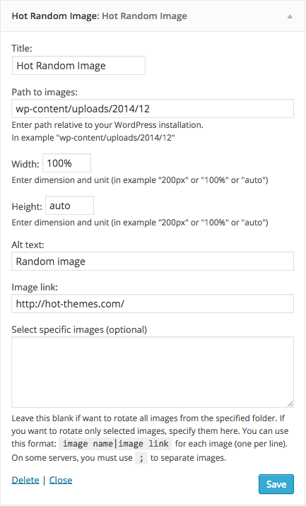 Go to Appearance > Widgets and drop Hot Random Image widget into any widget position. Then open it to see the widget options. Enter folder where your images are uploaded, relative to your WordPress installation. In example “wp-content/uploads/2024/01”.