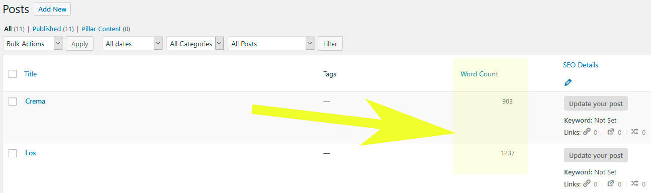 Adds a sortable column to the posts and pages admin list with the word count of each page/post.