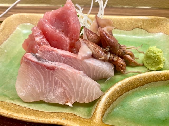 立ち食い蕎麦 酒処 稜(綾瀬)海苔天うどん+天丼+なす納豆天+ホタルイカ酢味噌+刺身三種盛