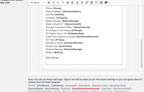 The Solar Wizard will send your customers an email at the completion of the Wizard with the information they entered. The email can be adjusted to send during certain business hours or immediately after completion. You can opt to turn this feature off by unchecking the “Send Notification to User?” checkbox.